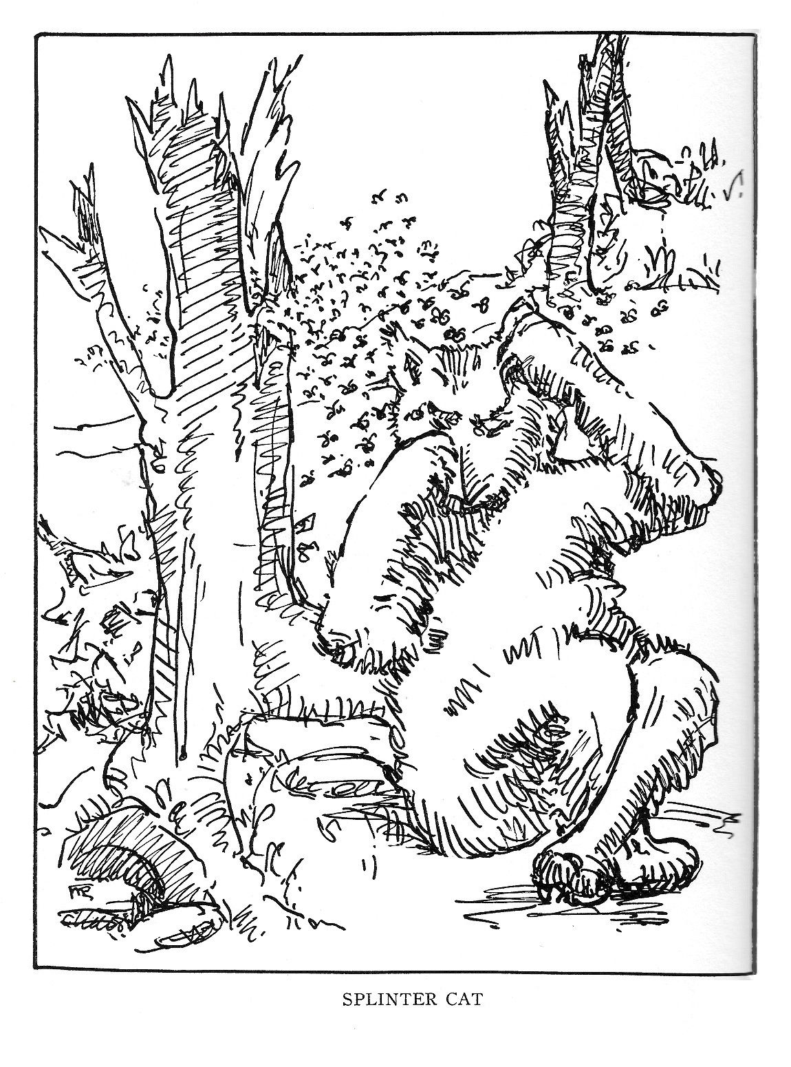 A heavy, chunky body with a short wheelbase, mounted on tremendously powerful legs, with the countenance in a wedge-shaped nose formed of unusually dense bone, the Splinter Cat goes a-roaming in search of hollow trees, since bees, honey and coons are his favorite diet. He climbs a tree, guns-himself at the desired hole, and projects himself at it with terrific force. The bony nasal process splinters and shatters the stem, sometimes snapping it clean off. If the Cat finds food in the ruptured trunk, he is temporarily appeased. If not, he goes immediately for another tree. And right there is the big trouble. The Cat doesn’t use any judgment in selecting trees, he just smashes one after another until he gets a meal. Unlike more intelligent parties, he doesn’t seem to be able to learn the outward signs of a bee or coon-tree.