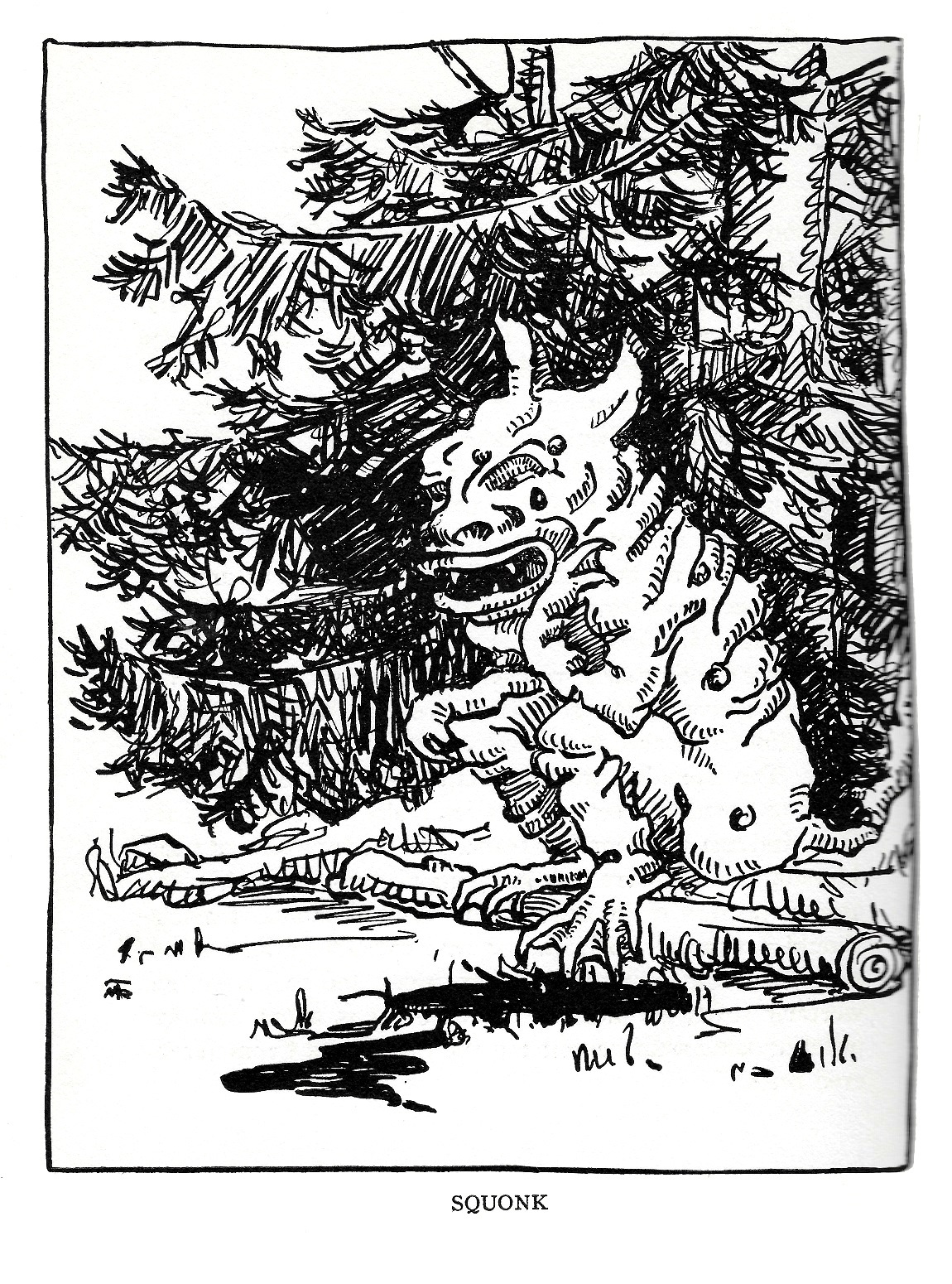 To-day the Squonk is met with solely in the hemlock forests of Pennsylvania. It is a most retiring bashful, crepuscular animal, garbed in a loose, warty, singulary ill-fitting skin. The Squonk is always unhappy—even morbid. He is given to constant weeping over his really upsetting appearance, and can sometimes be tracked by his tear-stained trail. Moonlight nights are best for Squonk hunts, for then the animal prefers to lie quiet in its hemlock-home, fearing, should it venture forth, that it may catch a glimpse of itself in some moonlit pool. Sometimes you can hear one weeping softly to himself. The sound is a low note of pleading somewhat resembling the call of the Cross-feathered Snee.