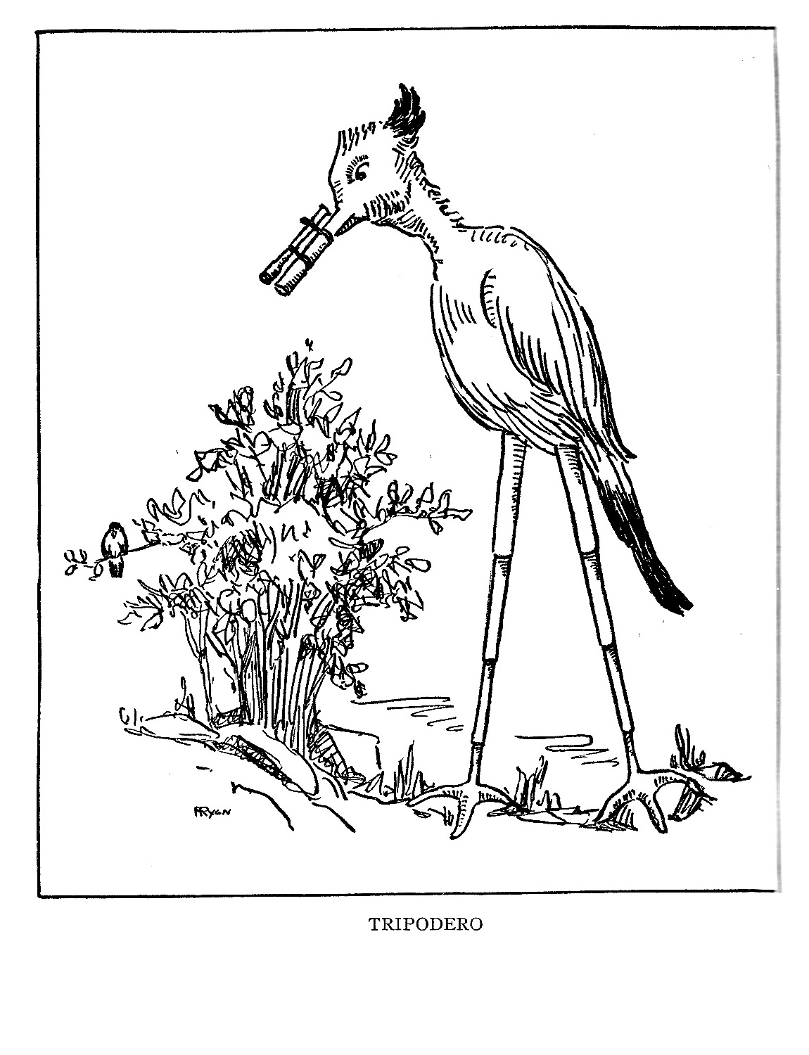 Birds and Other small animals constitute his main diet. He is not a fast traveler, but his extension legs (just like a transit) make it possible for him to prowl close to the ground. On spotting game, he slowly extends these legs until he gains a clear sight over the brush. Focusing the 4-power ’scope, the rifled, gun-like beak is carefully trained on the victim, a hardened clay pellet from the magazine in the cheek-pouch is inserted in the breech and puffed swiftly on its way. The target is instantly knocked senseless, and is then slowly eaten.